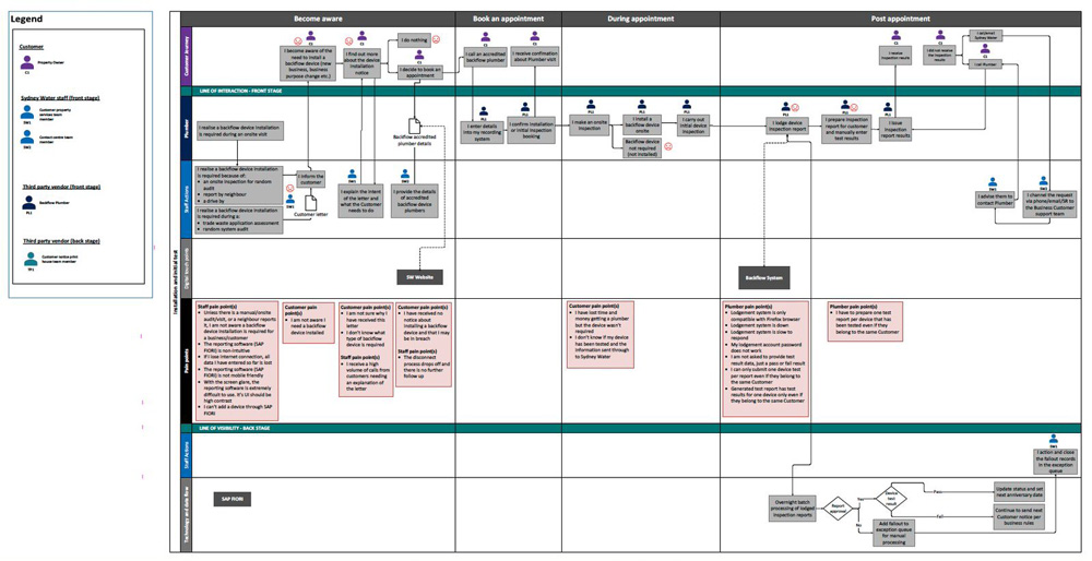 The data was then distilled into several service blueprints illustrating where those pain points occurred in the various user journeys.