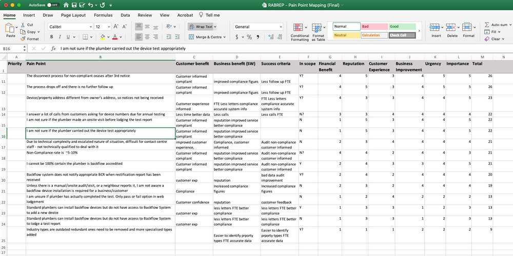 The pain points were weighted in collaboration with Business, and analysed to ensure business requirements were met, and the most significant the pain points would be addressed.